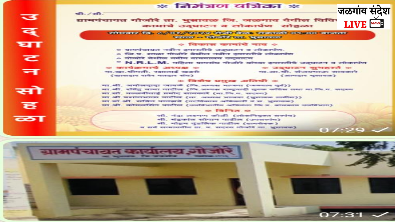 भुसावळ – तालुक्यातील गोजोरे येथे दि.८ जानेवारी रोजी सकाळी ९ वाजता विविध विकास कामांचे उद्घाटन आ. संजयभाऊ सावकारे यांच्या हस्ते करण्यात येणार आहे या कार्यक्रमाचे अध्यक्ष खा. रक्षाताई खडसे या राहणार असून प्रमुख पाहुणे भाजपाचे जिल्हाध्यक्ष अमोल जावळे, माजी जि प सदस्य रविंद्र नाना पाटील, पल्लवीताई सावकारे, भुसावळ भाजपाचे तालुकाध्यक्ष प्रशांत पाटील, गटविकास अधिकारी डॉ सचिन पानझडे, बांधकाम अभियंता कोमलसिंग पाटील हे राहणार असून यांच्या उपस्थितीत ग्रामपंचायत कार्यालय इमारत उद्घाटन व लोकार्पण, जिल्हा परिषद शाळा नविन इमारत चे लोकार्पण, गावातील विद्यार्थ्यांसाठी अनुकूल असे नविन वाचनालय, एन आर एल एम महिला ग्रामसंघाच्या इमारतीचे उद्घाटन करण्यात येणार आहे तरी परिसरातील सरपंच व उपसरपंच तसेच पदाधिकारी यांनी उपस्थित राहावे. असे आवाहन गोजोरे येथील नवनिर्वाचित लोकनियुक्त सरपंच सौ नंदा लक्ष्मण कोळी, उपसरपंच चंद्रकांत सोपान पाटील, ग्रामसेवक मोहन पाटील व सर्व ग्रामपंचायत सदस्य आणि ग्रामस्थांनी केले आहे.