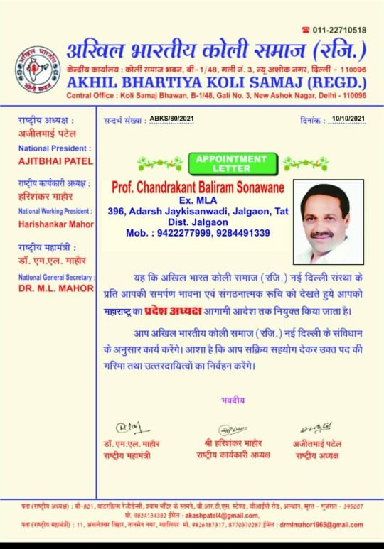चोपडा विधानसभा मतदारसंघाचे माजी आमदार चंद्रकांत सोनवणे आपल्या मतदारसंघाच्या विकास करत असतांना देखील…अखिल भारतीय कोली समाज संघटनेप्रति असलेली तळमळ समाज उपयोगी उपक्रम, संघटनात्मक कार्य पाहता महाराष्ट्र प्रदेश अध्यक्ष पदी नियुक्ती संघटनेच्या वतीने करण्यात आली… अभिनंदोन्त्सुक राजेद्र पाटील ता.प्रमुख,शहरप्रमुख आबा देशमुख ,नरेश महाजन ,हरीषभाऊ पाटील जि.प.सदस्य, एम व्ही पाटील पं.स.सदस्य, गंभीर सर , किशोर चौधरी, प्रकाश राजपुत ,राजाराम पाटील नगरसेवक चोपडा, विकास पाटील विधानसभा क्षेत्र प्रमुख,कैलास बाविस्कर समन्वय पुनिॕलोकन समिती, सदस्य इम्रान खाटीक अल्पसंख्याक ता.प्रमुख ,भोलाणर वकीलसाहेब जळगाव, मंगल इगळे ,किरण देवराज, दिपक कोळी ,प्रवीण कोळी ,देवीदास सोनवणे ,धिरज गुजराथी, हरीष पवार, सुनिल बरडिया ,शिवराज पाटील, समन्वय समिती सदस्य, सुकलाल कोळी, नितीन पाटील, आत्मा अध्यक्ष किरण करंदीकर, नरेंद्र बाविस्कर सर्व शिवसेना पदाधिकारी व समाजाच्या वतीने अभिनंदन करण्यात आले..