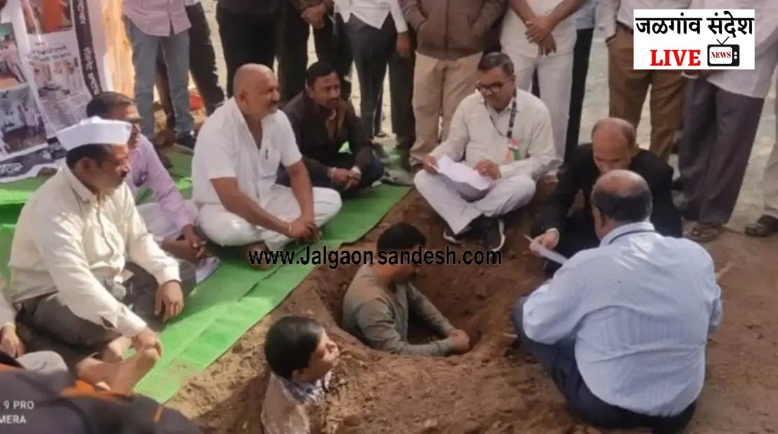 जळगावसह धुळे, नंदुरबार, अ.नगर, नाशिक, बिड, जालना जिल्ह्यात नानाजी देशमुख कृषी संजीवनी प्रकल्प व इतर नावे महाराष्ट्र सरकारने राबवलेल्या अनुदानित शेडनेट, पॉलिहाऊस यात झालेल्या भ्रष्ट्राचाराची चौकशी होऊन कारवाई करावी या मागणीसाठी अमळनेर येथे सचिन पाटील,अनंत निकम यांच्यासह चार शेतकऱ्यांनी स्वतःला मातीत गाळून घेत अनोख आंदोलन केले.
