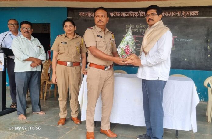 भुसावळ – जळगाव पोलीस अधीक्षक डाँ .महेश्वर रेड्डी यांच्या संकल्पनेतुन भुसावळ तालुका पोलीस स्टेशन हद्दीतील शाळांमध्ये जाऊन तालुका पोलीस स्टेशनचे पो.नि. महेश गायकवाड यांनी गुरु पौर्णिमा निमित्ताने शिक्षकांचा सत्कार केला. यावेळी आदर्श आयटीआय कुऱ्हा पानाचे येथील प्राचार्य श्री. कुरेशी सर, कुऱ्हा पानाचे येथील राजाराम धोंडू माध्यमिक विद्यालय येथील मुख्याध्यापक श्री. चौधरी सर, वराडसीम येथील पंडीत नेहरू विद्यालयाचे मुख्याध्यापक श्री. खेडकर सर, दादासाहेब दामू पाटील विद्यालय, सुनसगाव येथील श्री. जे.पी.सपकाळे सर यांना गुरूपौर्णिमा निमित्ताने शुभेच्छा दिल्या तसेच प्रतिनिधिक स्वरूपात या सर्व मुख्याध्यापकांचा सत्कार करण्यात आला . सुनसगाव येथील दादासाहेब दामु पांडू पाटील माध्यमिक विद्यालयात छोटेखानी कार्यक्रम घेण्यात आला त्यावेळी पो.नि. महेश गायकवाड व पोऊनि पुजा अंधारे यांनी विद्यार्थ्यांना मार्गदर्शन केले. यावेळी तालुका पोलीस स्टेशन चे विनोद पाटील , श्री येवलकर ,पत्रकार जितेंद्र काटे , सामाजिक कार्यकर्ते प्रविण दांडगे हे उपस्थित होते.