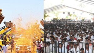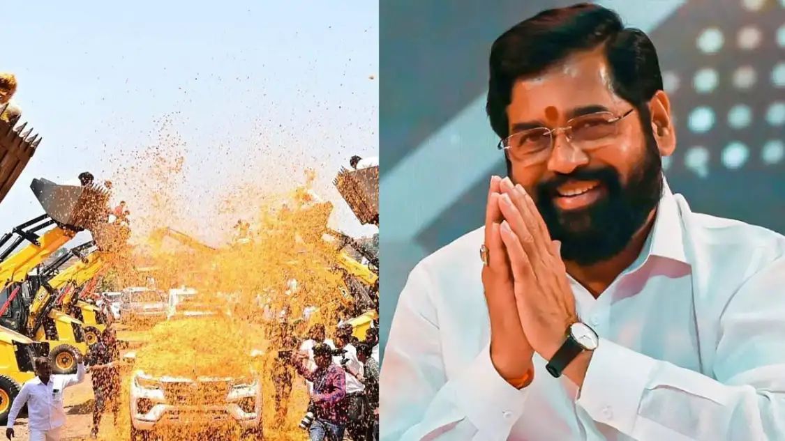 मुख्यमंत्र्यांसमोर शक्तीप्रदर्शन करत देसाईंनी दाखवली ताकद; ताफ्यावर 50 जेसीबीतून फुलांचा वर्षाव