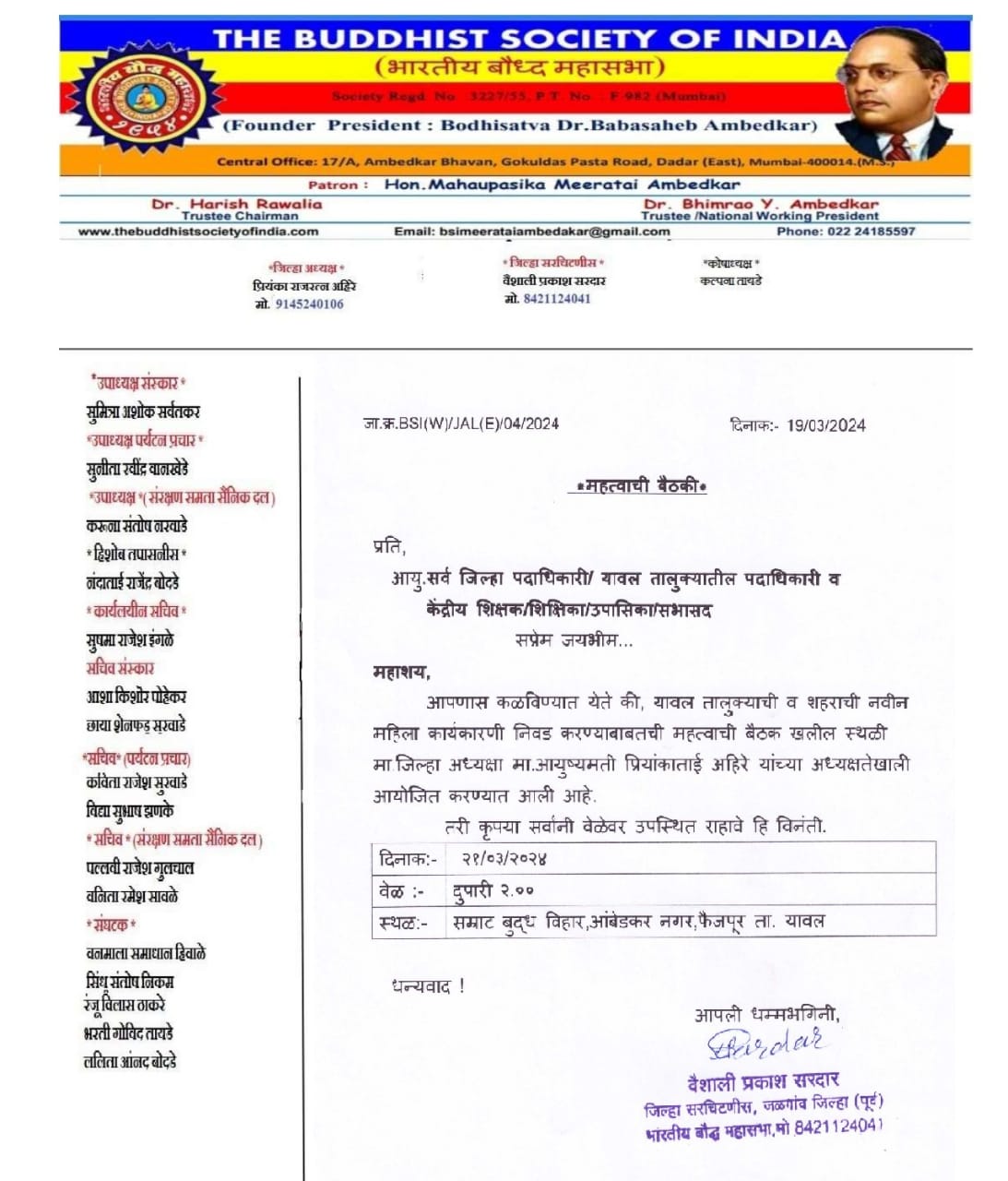 सदर बैठक भुसावळ येथील दुपारी 12 वाजता शील रत्न बुद्ध विहार, चांदमारी चाळ, येथे होणार आहे. तर यावल तालुक्यातील फैजपूर येथील सम्राट बुद्ध विहार, आंबेडकर नगर, येथे होणार आहे. या बैठकीला जिल्हा कार्यकारणीचे सर्व पदाधिकारी, केंद्रीय शिक्षक, शिक्षिका, बोद्धचार्य, तालुक्यातील पदाधिकारी, बौद्ध उपासक व उपासिका यांनी उपस्थित राहावे असे आव्हान वैशाली सरदार यांनी केले आहे.