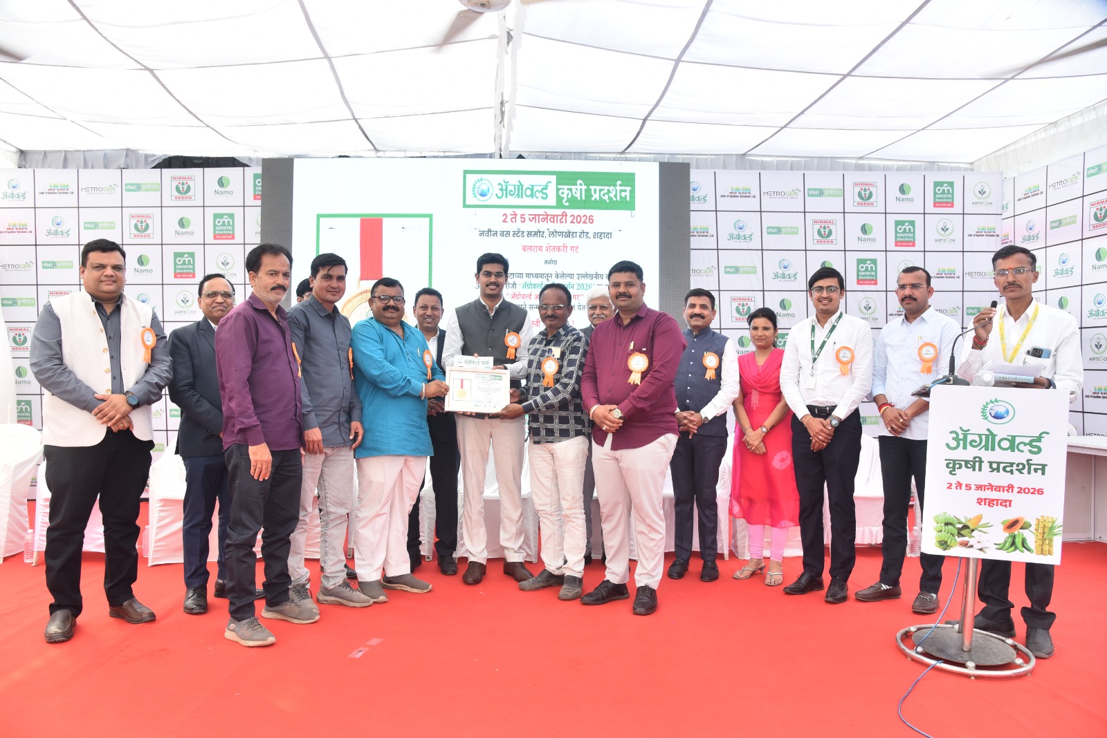 शहादा येथील नवीन बस स्टँड समोरील मैदानावर आयोजित ‘ॲग्रोवर्ल्ड कृषी प्रदर्शन २०२६’ मध्ये ३ जानेवारी रोजी हा पुरस्कार वितरण सोहळा पार पडला. हा प्रतिष्ठेचा पुरस्कार नंदुरबार जिल्हा परिषदेचे मुख्य कार्यकारी अधिकारी (CEO) मा. श्री. नमन गोयल साहेब यांच्या शुभहस्ते प्रदान करण्यात आला. याप्रसंगी कार्यक्रमाचे आयोजक आणि ॲग्रोवर्ल्डचे संचालक श्री. शैलेंद्र चव्हाण तसेच कृषी क्षेत्रातील विविध नामांकित कंपन्यांचे डायरेक्टर आणि पदाधिकारी उपस्थित होते.