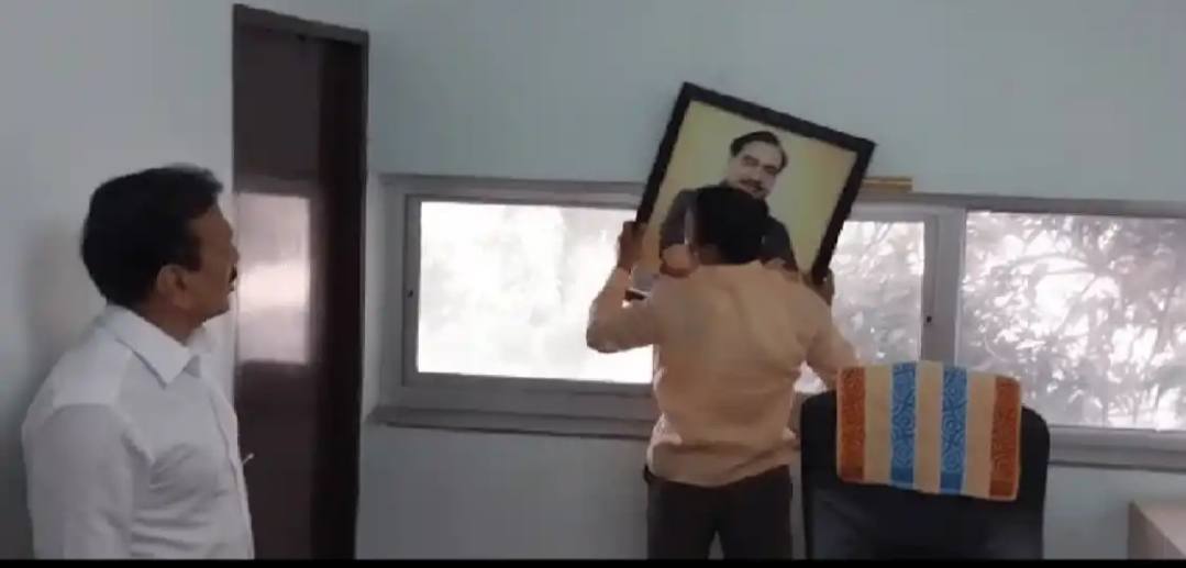 जळगाव: जळगाव जिल्हा दूध संघाच्या चेअरमनपदी भाजपचे आमदार मंगेश चव्हाण (चाळीसगाव) यांची बिनविरोध निवड करण्यात आली. चेअरमनपदाची सूत्रे सांभाळताच त्यांनी चेअरमनाच्या दालनात असलेला माजी मंत्री व राष्ट्रवादीचे आमदार एकनाथ खडसे यांचा फोटो हटविला.
