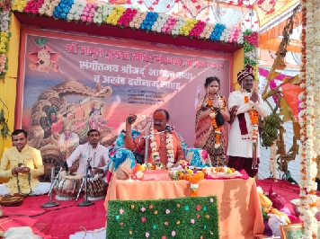 जळगाव -: कांचन नगरातील जागृत गुरुदत्त मंदिर तर्फे सुरू असलेल्या श्रीमद् भागवत कथेला राधा व कृष्णा यांच्या विवाहाचा देखावा किरण सोनवणे सीमा सोनवणे यांनी सादर केला व विवाह संपन्न झाला विवाहप्रसंगी प्रत्यक्ष नृत्य केले व आनंदी व वातावरण निर्माण झाले होते काहींनी अहिराचे पैसे वाजविले त्या प्रसंगी कथाचे निरूपण ह.भ.प मनोहर महाराज खोंडे करीत आहेत तसेच दिनांक ६/१२/२०२२ रोजी श्रीमद् भागवत कथेची कांचन नगरात संध्याकाळी ४ ते ७ शोभायात्रा काढण्यात आली व त्याच दिवशी रात्री ८.३० ते ११ वाजता ह.भ.प कुशाल महाराज म्हाळसा पिंपळगाव यांचे जाहीर कीर्तन होईल अशी माहिती विश्वस्त राजेंद्र कोळी यांनी दिली.