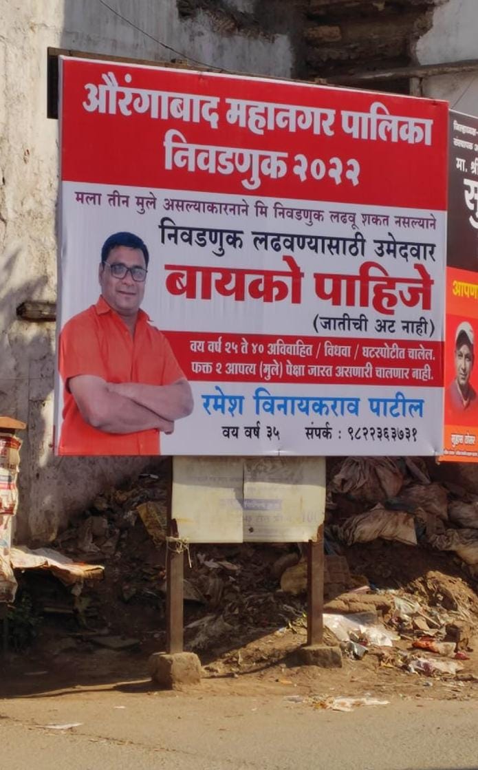 “औरंगाबाद महानगरपालिका निवडणूक २०२२. मला तीन मुले असल्याने मी निवडणूक लढवू शकत नाही. त्यामुळे निवडणूक लढवण्यासाठी उमेदवार बायको पाहिजे. यासाठी जातीची कोणतीही अट नाही. वय वर्ष २५ ते ४० अविवाहीत, विधवा, घटस्फोटित चालेल. फक्त २ पेक्षा जास्त अपत्ये असणारी चालणार नाही,” असा आशय या बॅनरवर लिहिण्यात आला आहे. या बॅनरवर त्यांनी त्यांचा संपर्क क्रमांक देखील टाकला आहे.