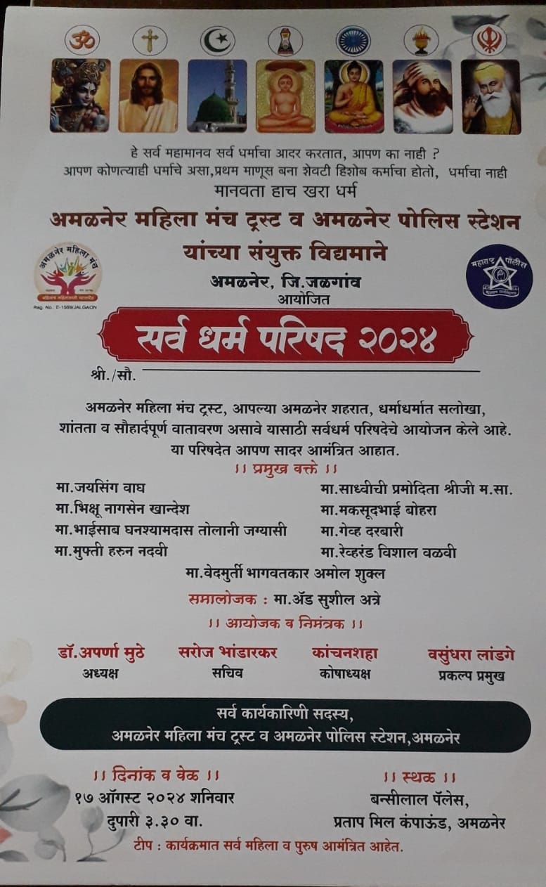 अमळनेर :- अमळनेर महिला मंच ट्रस्ट व पोलीस स्टेशन अमळनेर यांच्या संयुक्त विद्यमाने दिनांक १७ ऑगस्ट २०२४ शनिवार रोजी बन्सीलाल पॅलेस , प्रताप मिल परिसर अमळनेर येथे दुपारी ३.३० वाजता ‘सर्व धर्म परिषद’ चे आयोजन करण्यात आले आहे.
