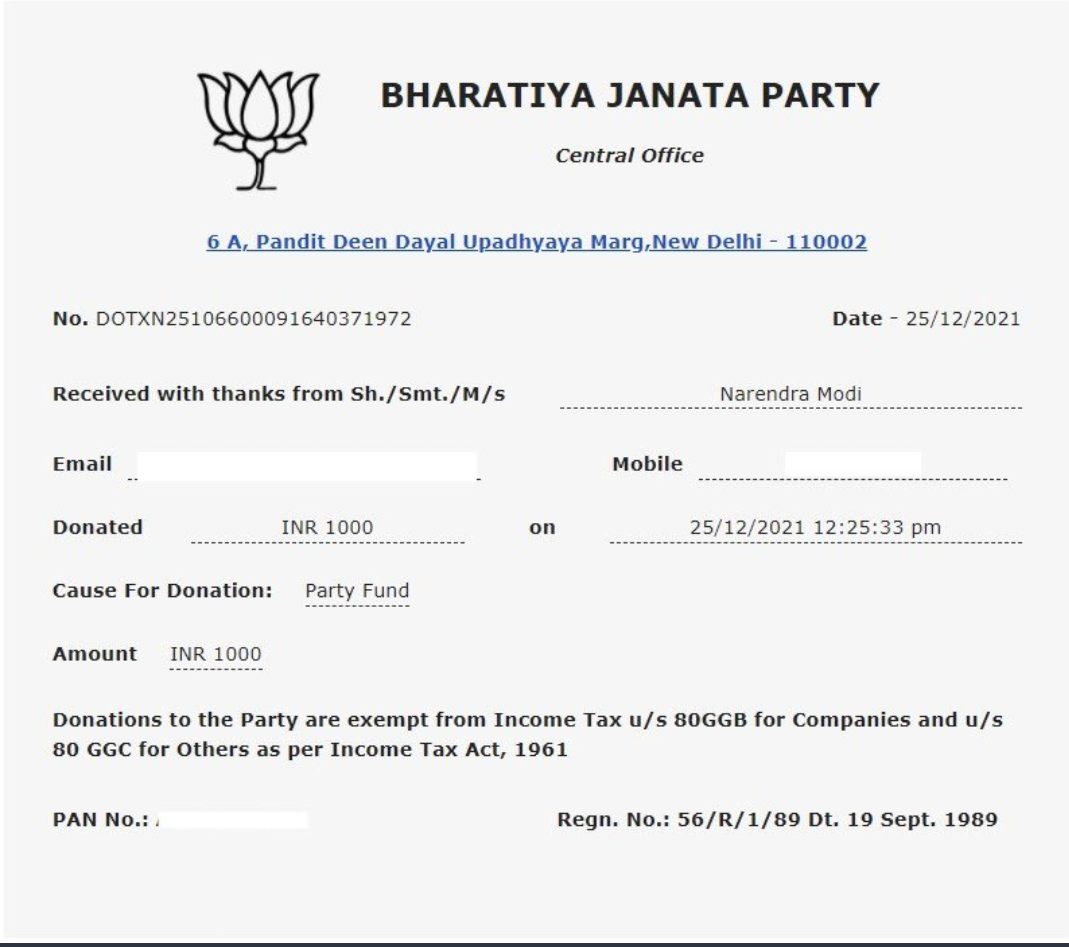 पंतप्रधान मोदींनी पक्षनिधी म्हणून १,००० रुपये दान केल्याची पावती ट्वीट करत म्हटलं, “मी भारतीय जनता पार्टीला १,००० रुपयांचा पक्षनिधी देणगी म्हणून दिलाय. आपला आदर्श कायमच देश सर्वप्रथम राहिला आहे. तुमच्या छोट्या देणगीमुळे पक्षाची निस्वार्थ सेवेची संस्कृती अशीच पुढे जाईल.”