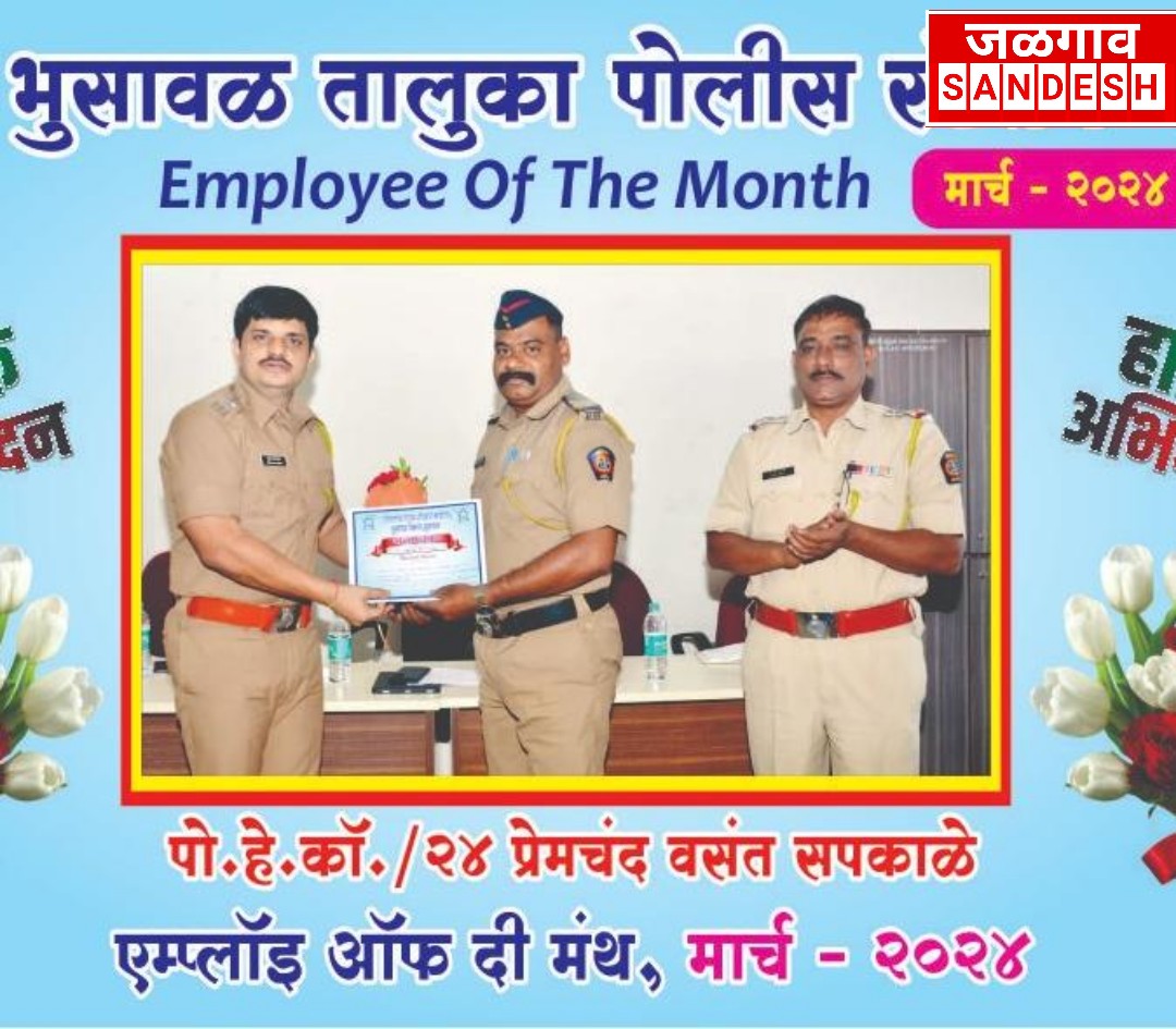 भुसावळ – येथील तालुका पोलीस स्टेशन चे पो.हे.काॅ. प्रेमचंद वसंत सपकाळे यांनी केलेल्या उत्कृष्ट व उल्लेखनीय कामगिरी बद्दल भुसावळ उपविभागीय पोलीस अधिकारी कार्यालया कडून मार्च २०२४ चा एम्प्लाॅइ आॅफ दी मंथ पुरस्काराने सन्मानित करण्यात आले. यावेळी भुसावळ उपविभागीय पोलीस अधिकारी कृष्णांत पिंगळे यांनी त्यांना प्रमाणपत्र व पुष्पगुच्छ देऊन सत्कार केला. यावेळी भुसावळ तालुका पोलीस स्टेशन चे पोलीस निरीक्षक बबनराव जगताप, एपीआय विशाल पाटील, पोऊनि पूजा अंधारे, कुऱ्हा पानाचे औट पोष्ट चे बीट हवालदार युनूस शेख, पोहेकाॅ बाविस्कर, दिपक जाधव, राहुल महाजन, उमेश बारी व पोलीस सहकारी उपस्थित होते. हा सन्मान सोहळा प्रत्येक महिन्याला केला जातो यात शहर पोलीस स्टेशन, बाजार पेठ पोलीस स्टेशन, वाहतूक पोलीस स्टेशन, तालुका पोलीस स्टेशन व नशिराबाद पोलीस स्टेशन अशा पोलीस स्टेशन मधील एक एक अधिकारी व कर्मचारी यांचा सत्कार केला जातो. भुसावळ उपविभागीय पोलीस अधिकारी कृष्णांत पिंगळे यांनी हा आदर्श कार्यक्रम सुरू केला असून या सत्कार सोहळ्या मुळे अधिकारी व कर्मचारी यांच्या कार्याची दखल घेतली जात असल्याने आनंद वाटतो असे सांगितले जात आहे.