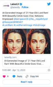 प्रभू श्री राम 21 व्या वर्षी कसे दिसायचे? हा प्रश्न अनेकांच्या मनात असेल. आता आर्टिफिशिअल इंटेलिजेन्सने प्रभू श्रीरामांचा तारूण्यातील फोटो तयार करून याचे उत्तर दिले आहे. एआयने दोन फोटो शेअर करत पहिल्या फोटोत प्रभू श्रीरामांच्या चेहऱ्यावरील हावभाव सामान्य आहेत. तर दुसऱ्या फोटोत ते स्मित हास्य करताना दिसत आहेत. हे फोटो सोशल मीडियावर प्रचंड व्हायरल होत आहे.