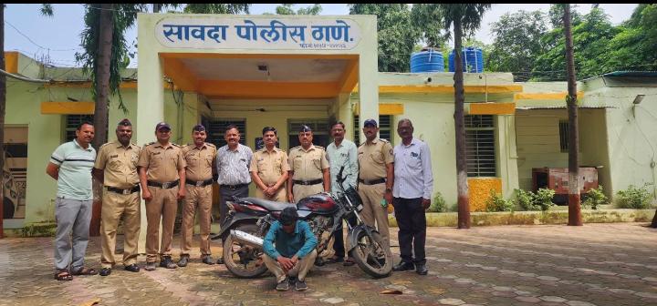 म्हणुन सावदा पोलीस स्टेशनला दि.18/08/2024 रोजी 22.39 वाजता भारतीय न्याय संहीती 2023 चे कलम 303(2) प्रमाणे गुन्हा दाखल करण्यात आलेला होता.सदर गेलेल्या मालाबाबत कोणतीही खात्रीलायक बातमी नसतांना सावदा पोलीस स्टेशन कडील स्टाफने गोपनीय माहीतीच्या आधारे चोरीस गेलेली मोटर सायकल व आरोपी याचा तपास करुन आरोपी नामे दिनेश लखन बारेला वय -36 वर्षे, रा. खयडी -बरडी प्रिंप्रीजवळ ता. भिकनगाव जि. खरगोन मध्यप्रदेश यास शिताफिने पकडुन त्याचेकडुन गेला माल मोटर सायकल हस्तगत केली आहे. सदरचा गुन्हा काही तासातच उघडकिस आणून उत्तम कामगीरी केलेली आहे. सदरची चांगली कामगिरी ही प्रभारी सहायक पोलीस निरीक्षक विशाल पाटील यांचे मार्गदर्शनाखाली सावदा पो स्टे येथील नेमणुकीचे सफौ बशीर तडवी, पोह संजीव चौधरी, पोह विनोद तडवी, पोह मझहर पठाण, पोना निलेश बाविस्कर यांनी केली आहे.