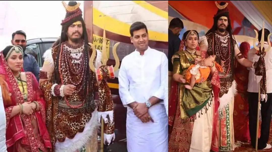 यामध्ये दुसऱ्या फोटोत पार्वतीची वेशभूषा केलेल्या महिलेच्या हातात बाळ असलेला फोटोही व्हायरल होत आहे. हा फोटो सोशल मीडियावर व्हायरल होत असून कुणी स्वागत करत आहे तर कुणी टीका करत आहे. हा फोटो मालेगाव येथे काढण्यात आला असून दोन दिवसांपूर्वीचा हा फोटो आहे. मुख्यमंत्री एकनाथ शिंदे यांचे पुत्र खासदार श्रीकांत शिंदे हे नाशिक, मालेगाव दौऱ्यावर आले होते. त्यादरम्यान मालेगाव येथे दादा भुसे यांच्या मार्गदर्शनाखाली महाशिवपुराण कथा आयोजित करण्यात आली आहे. प्रदीप मिश्रा यांच्या माध्यमातून ही महा शिवपुराण कथा सांगितली जात आहे. त्या दरम्यान नाशिक जिल्ह्याचे पालकमंत्री दादा भुसे यांच्या मुलगा आविष्कार भुसे आणि त्यांची सूनबाई यांनी शंकर पार्वतीची वेशभूषा केली होती. यावेळी शिवपुराण कथेला भेट देण्यासाठी आलेल्या श्रीकांत शिंदे यांच्या समवेत फोटो काढला होता.