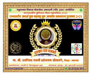 मनुष्यबळ विकास लोकसेवा अकादमी (मुंबई) आयोजित राज्यस्तरीय गुणीजन गौरव परिषदेच्या वतीने विविध क्षेत्रातील उल्लेखनीय कार्य करणाऱ्या व्यक्तींना पुरस्कार देऊन गौरविण्यात येणार आहे. नंदगाव येथील युवा सामाजिक कार्यकर्ते स्वप्निल सोनवणे हे गेल्या काही वर्षांपासून करित असलेल्या सामाजिक कार्याची दखल घेत मनुष्यबळ विकास लोकसेवा अकादमीच्या वतीने राज्यस्तरीय आदर्श युवा महाराष्ट्र युथ आयडॉल समाजरत्न पुरस्कार २०२१ जाहीर करण्यात आला आहे. या पुरस्काराचे वितरण २० डिसेंबर रोजी नाशिक येथे मान्यवरांच्या उपस्थितीत भव्य सोहळ्यात होणार आहे.