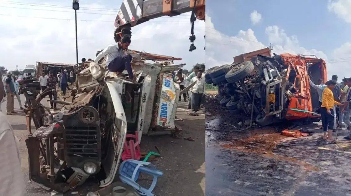याबाबत असे की, पारोळा तालुक्यातील बोळे येथून चिलाणे ता.शिंदखेडा येथे एका अंत्यसंस्कारसाठी प्रवाशी वाहतूक करणारे वाहन क्रमांक (एमएच-१८ एम ५५५४) हे २२ जणांना घेऊन जात होते. सकाळी १२ वाजेच्या सुमारास लोखंडी रोल असलेला एक कंटेनर क्रमांक (जीजे १२ बीडब्ल्यू ७२५४) चा ताबा सुटल्याने भरधाव वाहने पिकअप वाहनाला जोरदार धडक दिली.