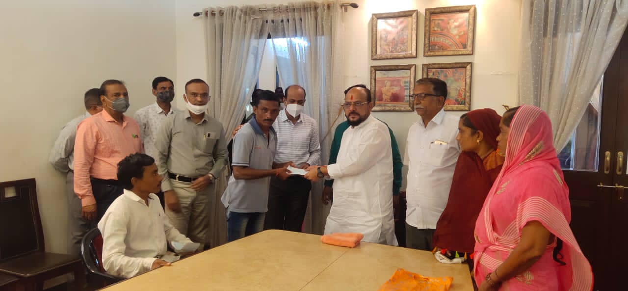 जळगाव : वीज कोसळून मयत झालेल्या तालुक्यातील एका महिलेच्या वारसांना तसेच जखमी झालेल्या दोघांना पालकमंत्री ना. गुलाबराव पाटील यांच्या हस्ते नैसर्गिक आपत्ती अंतर्गत मंजूर सानुग्रह अनुदानाचे वाटप करण्यात आले.