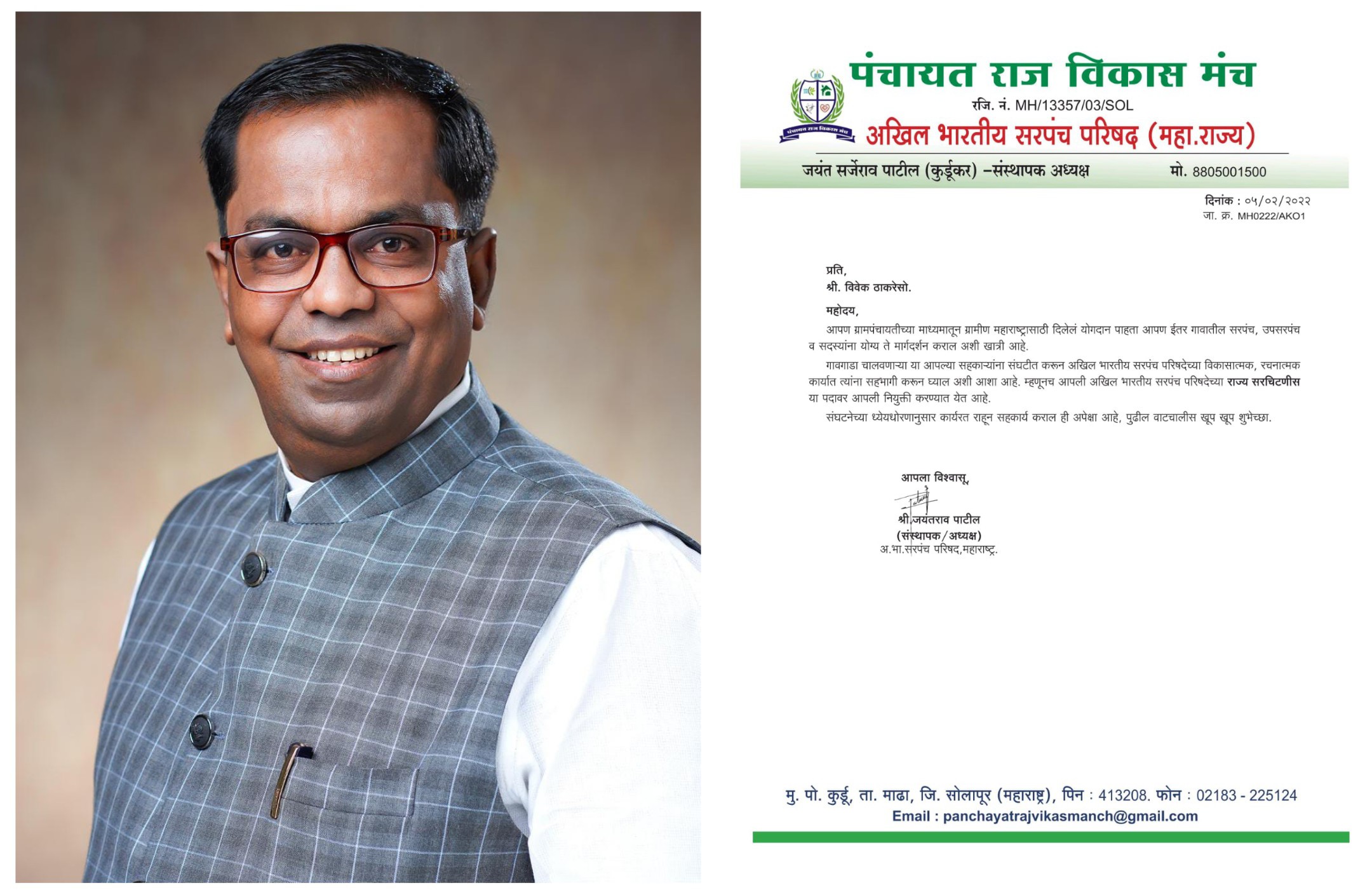 संघटनेचे संस्थापक आणि प्रदेशाध्यक्ष जयंत पाटील यांनी एका पत्रान्वये ही नियुक्ती जाहीर केली.श्री.ठाकरे हे मूळ रावेर तालुक्यातील निंभोरा गावाचे माजी उपसरपंच असून सद्या पुण्यातून ग्रामविकासाच्या योजनांसाठी कार्यरत ग्रामगौरव मासिक आणि ग्राम टीव्ही अशा डिजिटल मिडियाचे समूह संपादक म्हणून कार्यरत आहेत.त्यांच्या नियुक्तीचे आ.शिरीषदादा चौधरी,संघटनेचे राज्य उपाध्यक्ष शशिकांत मोरे, जळगाव जिल्हाध्यक्ष श्रीकांत महाजन, ॲड.देवा पंचभाई, सरचिटणीस पुरूजित चौधरी, राज्य संघटक गणेश पुजारी, ॲड.रुपेश ठाकरे,राजीव सवरणे, रावेर तालुकाध्यक्ष प्रमोद चौधरी राज्य संपर्क प्रमुख सचिन जगताप आदींनी स्वागत केले आहे.