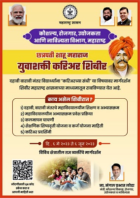 मुंबई – कुशल महाराष्ट्र, रोजगारयुक्त महाराष्ट्र घडविण्याच्या उद्देशाने कौशल्य, रोजगार, उद्योजकता व नाविन्यता विभागांतर्गत व्यवसाय शिक्षण व प्रशिक्षण संचालनालयामार्फत विद्यार्थी, युवक-युवतींसाठी राज्यातील 36 जिल्ह्यांत जिल्हास्तरावर तसेच राज्यातील सर्व 288 मतदारसंघांत 6 मे ते 6 जून 2023 या कालावधीत छत्रपती शाहू महाराज युवाशक्ती करिअर शिबिरांचे आयोजन करण्यात आले आहे.